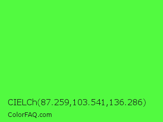 CIELCh 87.259,103.541,136.286 Color is a light green color and the nearest color is Screamin Green #66ff66. Hex code #52fa40 and RGB value is rgb(82,250,64). In RGB color space, this color is composed of 32% red, 98% green, 25% blue, In CMYK color space, this color is composed of 67% cyan, 0% magenta, 74% yellow , 2% black , In HSL color space, this color has a hue angle of 114° , 95% saturation and 62% lightness.