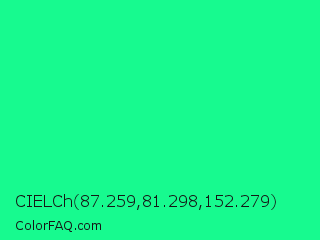 CIELCh 87.259,81.298,152.279 Color is a normal green color and the nearest color is Medium Spring Green #00fa9a. Hex code #17fa8f and RGB value is rgb(23,250,143). In RGB color space, this color is composed of 9% red, 98% green, 56% blue, In CMYK color space, this color is composed of 91% cyan, 0% magenta, 43% yellow , 2% black , In HSL color space, this color has a hue angle of 152° , 96% saturation and 54% lightness.