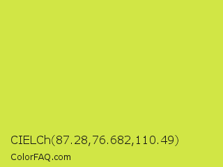 CIELCh 87.28,76.682,110.49 Color is a normal yellow color and the nearest color is Maximum Green Yellow #d9e650. Hex code #d1e645 and RGB value is rgb(209,230,69). In RGB color space, this color is composed of 82% red, 90% green, 27% blue, In CMYK color space, this color is composed of 9% cyan, 0% magenta, 70% yellow , 10% black , In HSL color space, this color has a hue angle of 68° , 76% saturation and 59% lightness.