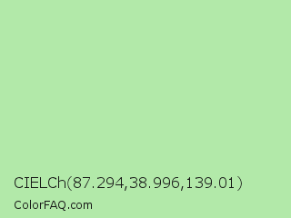 CIELCh 87.294,38.996,139.01 Color is a light green color and the nearest color is Celadon #ace1af. Hex code #b2e9a9 and RGB value is rgb(178,233,169). In RGB color space, this color is composed of 70% red, 91% green, 66% blue, In CMYK color space, this color is composed of 24% cyan, 0% magenta, 27% yellow , 9% black , In HSL color space, this color has a hue angle of 112° , 59% saturation and 79% lightness.