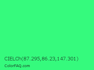 CIELCh 87.295,86.23,147.301 Color is a normal green color and the nearest color is UFO Green #3cd070. Hex code #35fa7d and RGB value is rgb(53,250,125). In RGB color space, this color is composed of 21% red, 98% green, 49% blue, In CMYK color space, this color is composed of 79% cyan, 0% magenta, 50% yellow , 2% black , In HSL color space, this color has a hue angle of 142° , 95% saturation and 59% lightness.