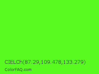 CIELCh 87.29,109.478,133.279 Color is a normal green color and the nearest color is Neon Green #39ff14. Hex code #59fa20 and RGB value is rgb(89,250,32). In RGB color space, this color is composed of 35% red, 98% green, 13% blue, In CMYK color space, this color is composed of 64% cyan, 0% magenta, 87% yellow , 2% black , In HSL color space, this color has a hue angle of 104° , 96% saturation and 55% lightness.