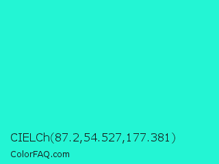 CIELCh 87.2,54.527,177.381 Color is a normal cyan color and the nearest color is Bright Turquoise #08e8de. Hex code #23f5d4 and RGB value is rgb(35,245,212). In RGB color space, this color is composed of 14% red, 96% green, 83% blue, In CMYK color space, this color is composed of 86% cyan, 0% magenta, 13% yellow , 4% black , In HSL color space, this color has a hue angle of 171° , 91% saturation and 55% lightness.