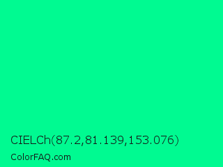 CIELCh 87.2,81.139,153.076 Color is a normal green color and the nearest color is Medium Spring Green #00fa9a. Hex code #00fa91 and RGB value is rgb(0,250,145). In RGB color space, this color is composed of 0% red, 98% green, 57% blue, In CMYK color space, this color is composed of 100% cyan, 0% magenta, 42% yellow , 2% black , In HSL color space, this color has a hue angle of 155° , 100% saturation and 49% lightness.