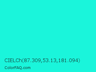 CIELCh 87.309,53.13,181.094 Color is a normal cyan color and the nearest color is Bright Turquoise #08e8de. Hex code #1af5db and RGB value is rgb(26,245,219). In RGB color space, this color is composed of 10% red, 96% green, 86% blue, In CMYK color space, this color is composed of 89% cyan, 0% magenta, 11% yellow , 4% black , In HSL color space, this color has a hue angle of 173° , 92% saturation and 53% lightness.