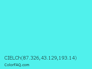 CIELCh 87.326,43.129,193.14 Color is a light cyan color and the nearest color is Turquoise #40e0d0. Hex code #50f1ec and RGB value is rgb(80,241,236). In RGB color space, this color is composed of 31% red, 95% green, 93% blue, In CMYK color space, this color is composed of 67% cyan, 0% magenta, 2% yellow , 5% black , In HSL color space, this color has a hue angle of 178° , 85% saturation and 63% lightness.