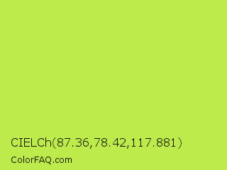 CIELCh 87.36,78.42,117.881 Color is a light lime color and the nearest color is June Bud #bdda57. Hex code #bdeb4b and RGB value is rgb(189,235,75). In RGB color space, this color is composed of 74% red, 92% green, 29% blue, In CMYK color space, this color is composed of 20% cyan, 0% magenta, 68% yellow , 8% black , In HSL color space, this color has a hue angle of 77° , 80% saturation and 61% lightness.