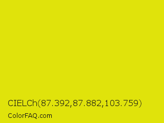 CIELCh 87.392,87.882,103.759 Color is a normal yellow color and the nearest color is Piss Yellow #e1e115. Hex code #e0e30b and RGB value is rgb(224,227,11). In RGB color space, this color is composed of 88% red, 89% green, 4% blue, In CMYK color space, this color is composed of 1% cyan, 0% magenta, 95% yellow , 11% black , In HSL color space, this color has a hue angle of 61° , 91% saturation and 47% lightness.