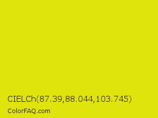 CIELCh 87.39,88.044,103.745 Color is a normal yellow color and the nearest color is Peridot #e6e200. Hex code #e0e309 and RGB value is rgb(224,227,9). In RGB color space, this color is composed of 88% red, 89% green, 4% blue, In CMYK color space, this color is composed of 1% cyan, 0% magenta, 96% yellow , 11% black , In HSL color space, this color has a hue angle of 61° , 92% saturation and 46% lightness.