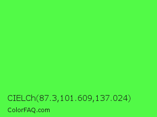CIELCh 87.3,101.609,137.024 Color is a light green color and the nearest color is Screamin Green #66ff66. Hex code #52fa47 and RGB value is rgb(82,250,71). In RGB color space, this color is composed of 32% red, 98% green, 28% blue, In CMYK color space, this color is composed of 67% cyan, 0% magenta, 72% yellow , 2% black , In HSL color space, this color has a hue angle of 116° , 95% saturation and 63% lightness.