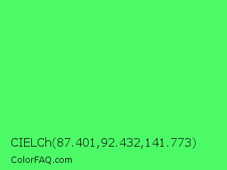 CIELCh 87.401,92.432,141.773 Color is a light green color and the nearest color is Screamin Green #66ff66. Hex code #4bfa66 and RGB value is rgb(75,250,102). In RGB color space, this color is composed of 29% red, 98% green, 40% blue, In CMYK color space, this color is composed of 70% cyan, 0% magenta, 59% yellow , 2% black , In HSL color space, this color has a hue angle of 129° , 95% saturation and 64% lightness.