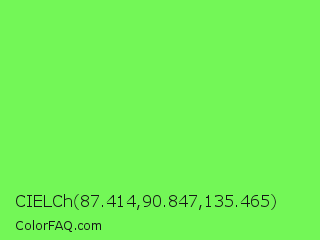 CIELCh 87.414,90.847,135.465 Color is a light green color and the nearest color is Screamin Green #66ff66. Hex code #73f757 and RGB value is rgb(115,247,87). In RGB color space, this color is composed of 45% red, 97% green, 34% blue, In CMYK color space, this color is composed of 53% cyan, 0% magenta, 65% yellow , 3% black , In HSL color space, this color has a hue angle of 110° , 91% saturation and 65% lightness.