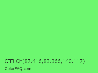 CIELCh 87.416,83.366,140.117 Color is a light green color and the nearest color is Screamin Green #66ff66. Hex code #6cf76f and RGB value is rgb(108,247,111). In RGB color space, this color is composed of 42% red, 97% green, 44% blue, In CMYK color space, this color is composed of 56% cyan, 0% magenta, 55% yellow , 3% black , In HSL color space, this color has a hue angle of 121° , 90% saturation and 70% lightness.