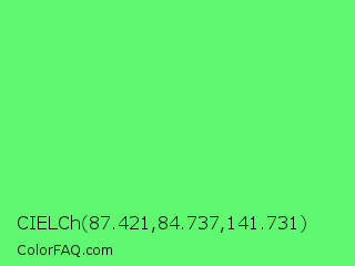 CIELCh 87.421,84.737,141.731 Color is a light green color and the nearest color is Screamin Green #66ff66. Hex code #61f871 and RGB value is rgb(97,248,113). In RGB color space, this color is composed of 38% red, 97% green, 44% blue, In CMYK color space, this color is composed of 61% cyan, 0% magenta, 54% yellow , 3% black , In HSL color space, this color has a hue angle of 126° , 92% saturation and 68% lightness.