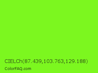 CIELCh 87.439,103.763,129.188 Color is a normal green color and the nearest color is Spring Frost #87ff2a. Hex code #7cf71f and RGB value is rgb(124,247,31). In RGB color space, this color is composed of 49% red, 97% green, 12% blue, In CMYK color space, this color is composed of 50% cyan, 0% magenta, 87% yellow , 3% black , In HSL color space, this color has a hue angle of 94° , 93% saturation and 55% lightness.