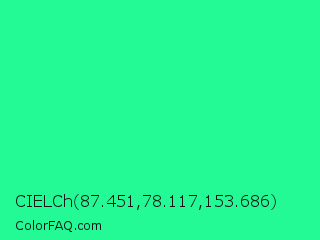 CIELCh 87.451,78.117,153.686 Color is a normal green color and the nearest color is Medium Spring Green #00fa9a. Hex code #23fa96 and RGB value is rgb(35,250,150). In RGB color space, this color is composed of 14% red, 98% green, 59% blue, In CMYK color space, this color is composed of 86% cyan, 0% magenta, 40% yellow , 2% black , In HSL color space, this color has a hue angle of 152° , 96% saturation and 56% lightness.