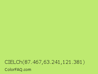 CIELCh 87.467,63.241,121.381 Color is a light green color and the nearest color is Sulu #c1f07c. Hex code #beea70 and RGB value is rgb(190,234,112). In RGB color space, this color is composed of 75% red, 92% green, 44% blue, In CMYK color space, this color is composed of 19% cyan, 0% magenta, 52% yellow , 8% black , In HSL color space, this color has a hue angle of 82° , 74% saturation and 68% lightness.