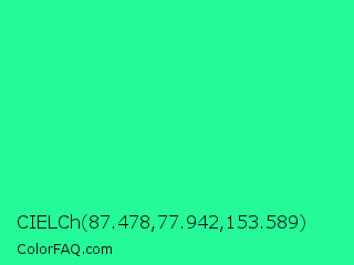CIELCh 87.478,77.942,153.589 Color is a normal green color and the nearest color is Medium Spring Green #00fa9a. Hex code #26fa96 and RGB value is rgb(38,250,150). In RGB color space, this color is composed of 15% red, 98% green, 59% blue, In CMYK color space, this color is composed of 85% cyan, 0% magenta, 40% yellow , 2% black , In HSL color space, this color has a hue angle of 152° , 95% saturation and 56% lightness.