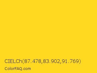 CIELCh 87.478,83.902,91.769 Color is a normal yellow color and the nearest color is Candlelight #fcd917. Hex code #ffd91f and RGB value is rgb(255,217,31). In RGB color space, this color is composed of 100% red, 85% green, 12% blue, In CMYK color space, this color is composed of 0% cyan, 15% magenta, 88% yellow , 0% black , In HSL color space, this color has a hue angle of 50° , 100% saturation and 56% lightness.