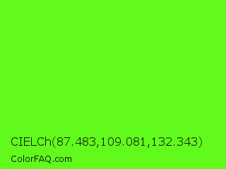 CIELCh 87.483,109.081,132.343 Color is a normal green color and the nearest color is Bright Green #66ff00. Hex code #61fa1c and RGB value is rgb(97,250,28). In RGB color space, this color is composed of 38% red, 98% green, 11% blue, In CMYK color space, this color is composed of 61% cyan, 0% magenta, 89% yellow , 2% black , In HSL color space, this color has a hue angle of 101° , 96% saturation and 55% lightness.