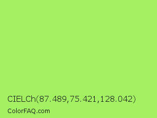 CIELCh 87.489,75.421,128.042 Color is a light green color and the nearest color is Inchworm #b2ec5d. Hex code #a3f063 and RGB value is rgb(163,240,99). In RGB color space, this color is composed of 64% red, 94% green, 39% blue, In CMYK color space, this color is composed of 32% cyan, 0% magenta, 59% yellow , 6% black , In HSL color space, this color has a hue angle of 93° , 82% saturation and 66% lightness.