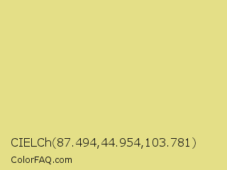 CIELCh 87.494,44.954,103.781 Color is a light yellow color and the nearest color is Flax #eedc82. Hex code #e4df87 and RGB value is rgb(228,223,135). In RGB color space, this color is composed of 89% red, 87% green, 53% blue, In CMYK color space, this color is composed of 0% cyan, 2% magenta, 41% yellow , 11% black , In HSL color space, this color has a hue angle of 57° , 63% saturation and 71% lightness.