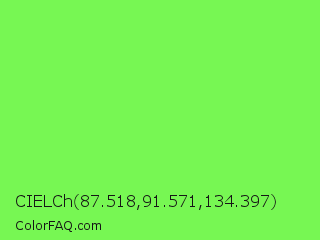 CIELCh 87.518,91.571,134.397 Color is a light green color and the nearest color is Screamin Green #66ff66. Hex code #77f753 and RGB value is rgb(119,247,83). In RGB color space, this color is composed of 47% red, 97% green, 33% blue, In CMYK color space, this color is composed of 52% cyan, 0% magenta, 66% yellow , 3% black , In HSL color space, this color has a hue angle of 107° , 91% saturation and 65% lightness.