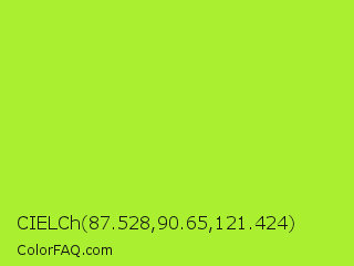 CIELCh 87.528,90.65,121.424 Color is a normal green color and the nearest color is Green Lizard #a7f432. Hex code #aaf031 and RGB value is rgb(170,240,49). In RGB color space, this color is composed of 67% red, 94% green, 19% blue, In CMYK color space, this color is composed of 29% cyan, 0% magenta, 80% yellow , 6% black , In HSL color space, this color has a hue angle of 82° , 86% saturation and 57% lightness.