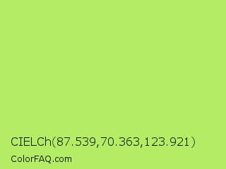 CIELCh 87.539,70.363,123.921 Color is a light green color and the nearest color is Inchworm #b2ec5d. Hex code #b3ed66 and RGB value is rgb(179,237,102). In RGB color space, this color is composed of 70% red, 93% green, 40% blue, In CMYK color space, this color is composed of 24% cyan, 0% magenta, 57% yellow , 7% black , In HSL color space, this color has a hue angle of 86° , 79% saturation and 66% lightness.