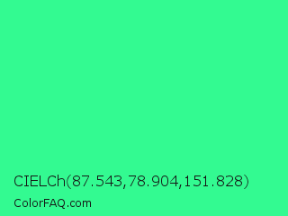 CIELCh 87.543,78.904,151.828 Color is a normal green color and the nearest color is Eucalyptus #44d7a8. Hex code #33fa91 and RGB value is rgb(51,250,145). In RGB color space, this color is composed of 20% red, 98% green, 57% blue, In CMYK color space, this color is composed of 80% cyan, 0% magenta, 42% yellow , 2% black , In HSL color space, this color has a hue angle of 148° , 95% saturation and 59% lightness.