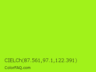 CIELCh 87.561,97.1,122.391 Color is a normal green color and the nearest color is Inch Worm #b0e313. Hex code #a1f21a and RGB value is rgb(161,242,26). In RGB color space, this color is composed of 63% red, 95% green, 10% blue, In CMYK color space, this color is composed of 33% cyan, 0% magenta, 89% yellow , 5% black , In HSL color space, this color has a hue angle of 83° , 89% saturation and 53% lightness.