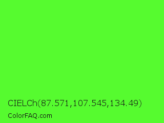 CIELCh 87.571,107.545,134.49 Color is a normal green color and the nearest color is Neon Green #39ff14. Hex code #56fb2f and RGB value is rgb(86,251,47). In RGB color space, this color is composed of 34% red, 98% green, 18% blue, In CMYK color space, this color is composed of 66% cyan, 0% magenta, 81% yellow , 2% black , In HSL color space, this color has a hue angle of 109° , 96% saturation and 58% lightness.