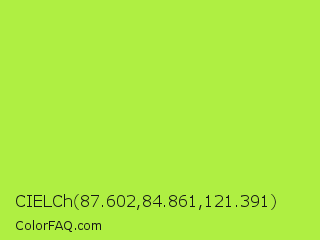 CIELCh 87.602,84.861,121.391 Color is a normal green color and the nearest color is Green Lizard #a7f432. Hex code #afef42 and RGB value is rgb(175,239,66). In RGB color space, this color is composed of 69% red, 94% green, 26% blue, In CMYK color space, this color is composed of 27% cyan, 0% magenta, 72% yellow , 6% black , In HSL color space, this color has a hue angle of 82° , 84% saturation and 60% lightness.