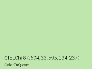 CIELCh 87.604,33.595,134.237 Color is a light green color and the nearest color is Sprout #c1d7b0. Hex code #bfe7ad and RGB value is rgb(191,231,173). In RGB color space, this color is composed of 75% red, 91% green, 68% blue, In CMYK color space, this color is composed of 17% cyan, 0% magenta, 25% yellow , 9% black , In HSL color space, this color has a hue angle of 101° , 55% saturation and 79% lightness.