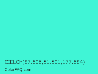 CIELCh 87.606,51.501,177.684 Color is a light cyan color and the nearest color is Turquoise #40e0d0. Hex code #40f5d6 and RGB value is rgb(64,245,214). In RGB color space, this color is composed of 25% red, 96% green, 84% blue, In CMYK color space, this color is composed of 74% cyan, 0% magenta, 13% yellow , 4% black , In HSL color space, this color has a hue angle of 170° , 90% saturation and 61% lightness.
