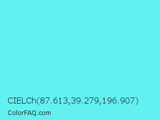 CIELCh 87.613,39.279,196.907 Color is a light cyan color and the nearest color is Turquoise Blue #6cdae7. Hex code #63f0f0 and RGB value is rgb(99,240,240). In RGB color space, this color is composed of 39% red, 94% green, 94% blue, In CMYK color space, this color is composed of 59% cyan, 0% magenta, 0% yellow , 6% black , In HSL color space, this color has a hue angle of 180° , 82% saturation and 66% lightness.