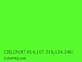 CIELCh 87.614,107.519,134.246 Color is a normal green color and the nearest color is Neon Green #39ff14. Hex code #58fb2e and RGB value is rgb(88,251,46). In RGB color space, this color is composed of 35% red, 98% green, 18% blue, In CMYK color space, this color is composed of 65% cyan, 0% magenta, 82% yellow , 2% black , In HSL color space, this color has a hue angle of 108° , 96% saturation and 58% lightness.