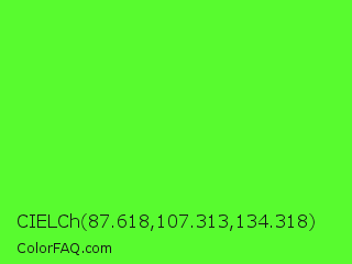 CIELCh 87.618,107.313,134.318 Color is a normal green color and the nearest color is Neon Green #39ff14. Hex code #58fb2f and RGB value is rgb(88,251,47). In RGB color space, this color is composed of 35% red, 98% green, 18% blue, In CMYK color space, this color is composed of 65% cyan, 0% magenta, 81% yellow , 2% black , In HSL color space, this color has a hue angle of 108° , 96% saturation and 58% lightness.