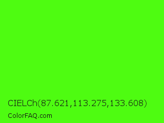 CIELCh 87.621,113.275,133.608 Color is a normal green color and the nearest color is Chlorophyll Green #4aff00. Hex code #4efc11 and RGB value is rgb(78,252,17). In RGB color space, this color is composed of 31% red, 99% green, 7% blue, In CMYK color space, this color is composed of 69% cyan, 0% magenta, 93% yellow , 1% black , In HSL color space, this color has a hue angle of 104° , 98% saturation and 53% lightness.