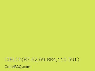 CIELCh 87.62,69.884,110.591 Color is a light yellow color and the nearest color is Maximum Green Yellow #d9e650. Hex code #d4e657 and RGB value is rgb(212,230,87). In RGB color space, this color is composed of 83% red, 90% green, 34% blue, In CMYK color space, this color is composed of 8% cyan, 0% magenta, 62% yellow , 10% black , In HSL color space, this color has a hue angle of 68° , 74% saturation and 62% lightness.