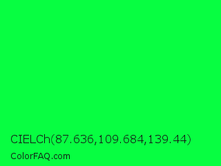 CIELCh 87.636,109.684,139.44 Color is a normal green color and the nearest color is Malachite #0bda51. Hex code #07fe41 and RGB value is rgb(7,254,65). In RGB color space, this color is composed of 3% red, 100% green, 25% blue, In CMYK color space, this color is composed of 97% cyan, 0% magenta, 74% yellow , 0% black , In HSL color space, this color has a hue angle of 134° , 99% saturation and 51% lightness.