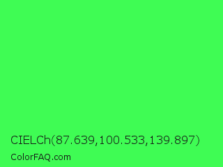 CIELCh 87.639,100.533,139.897 Color is a light green color and the nearest color is Screamin Green #66ff66. Hex code #3ffc54 and RGB value is rgb(63,252,84). In RGB color space, this color is composed of 25% red, 99% green, 33% blue, In CMYK color space, this color is composed of 75% cyan, 0% magenta, 67% yellow , 1% black , In HSL color space, this color has a hue angle of 127° , 97% saturation and 62% lightness.