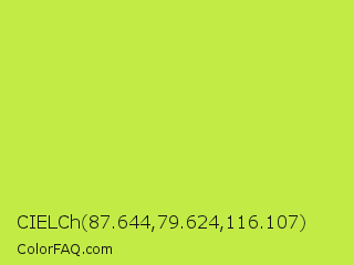 CIELCh 87.644,79.624,116.107 Color is a normal lime color and the nearest color is June Bud #bdda57. Hex code #c2eb46 and RGB value is rgb(194,235,70). In RGB color space, this color is composed of 76% red, 92% green, 27% blue, In CMYK color space, this color is composed of 17% cyan, 0% magenta, 70% yellow , 8% black , In HSL color space, this color has a hue angle of 75° , 80% saturation and 60% lightness.