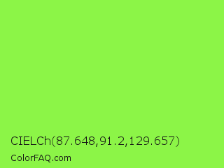 CIELCh 87.648,91.2,129.657 Color is a light green color and the nearest color is Kiwi #8ee53f. Hex code #8cf547 and RGB value is rgb(140,245,71). In RGB color space, this color is composed of 55% red, 96% green, 28% blue, In CMYK color space, this color is composed of 43% cyan, 0% magenta, 71% yellow , 4% black , In HSL color space, this color has a hue angle of 96° , 90% saturation and 62% lightness.