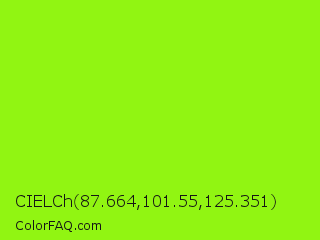 CIELCh 87.664,101.55,125.351 Color is a normal green color and the nearest color is Chartreuse #7fff00. Hex code #91f512 and RGB value is rgb(145,245,18). In RGB color space, this color is composed of 57% red, 96% green, 7% blue, In CMYK color space, this color is composed of 41% cyan, 0% magenta, 93% yellow , 4% black , In HSL color space, this color has a hue angle of 86° , 92% saturation and 52% lightness.