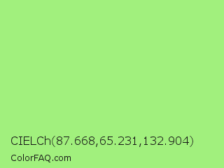 CIELCh 87.668,65.231,132.904 Color is a light green color and the nearest color is Feijoa #9fdd8c. Hex code #a1f07d and RGB value is rgb(161,240,125). In RGB color space, this color is composed of 63% red, 94% green, 49% blue, In CMYK color space, this color is composed of 33% cyan, 0% magenta, 48% yellow , 6% black , In HSL color space, this color has a hue angle of 101° , 79% saturation and 72% lightness.