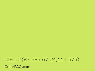 CIELCh 87.686,67.24,114.575 Color is a light lime color and the nearest color is Booger Buster #dde26a. Hex code #cce861 and RGB value is rgb(204,232,97). In RGB color space, this color is composed of 80% red, 91% green, 38% blue, In CMYK color space, this color is composed of 12% cyan, 0% magenta, 58% yellow , 9% black , In HSL color space, this color has a hue angle of 72° , 75% saturation and 65% lightness.
