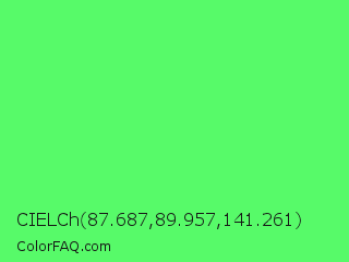 CIELCh 87.687,89.957,141.261 Color is a light green color and the nearest color is Screamin Green #66ff66. Hex code #57fa69 and RGB value is rgb(87,250,105). In RGB color space, this color is composed of 34% red, 98% green, 41% blue, In CMYK color space, this color is composed of 65% cyan, 0% magenta, 58% yellow , 2% black , In HSL color space, this color has a hue angle of 127° , 94% saturation and 66% lightness.