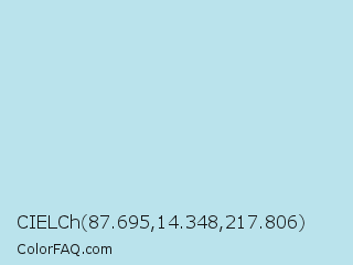 CIELCh 87.695,14.348,217.806 Color is a very light cyan color and the nearest color is Jagged Ice #c2e8e5. Hex code #bae3ec and RGB value is rgb(186,227,236). In RGB color space, this color is composed of 73% red, 89% green, 93% blue, In CMYK color space, this color is composed of 21% cyan, 4% magenta, 0% yellow , 7% black , In HSL color space, this color has a hue angle of 191° , 57% saturation and 83% lightness.