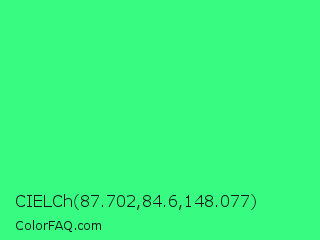CIELCh 87.702,84.6,148.077 Color is a normal green color and the nearest color is UFO Green #3cd070. Hex code #38fb82 and RGB value is rgb(56,251,130). In RGB color space, this color is composed of 22% red, 98% green, 51% blue, In CMYK color space, this color is composed of 78% cyan, 0% magenta, 48% yellow , 2% black , In HSL color space, this color has a hue angle of 143° , 96% saturation and 60% lightness.